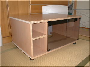 最後にキャスターを取り付け、 棚板をはめ込んで完成です。 非常に完成度の高い 仕上がりでしょ。 この秘訣は、最初の木取りと マルノコの精度でしょう。 フ〜、まずまずかな。 |