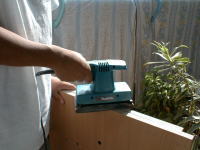 木口は仕上げサンダーでバリを取りザラつきも落としましょう。 天板のビスは、あとで埋め釘を するので5mmほどめり込ませます。 天板と底板の位置がずれない様に 木工ボンドで仮止めしてから うちます。 |