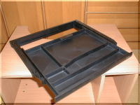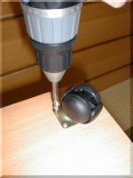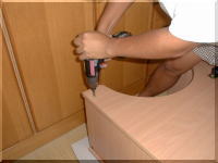 いよいよ後半、 ペンシルトレーを天板の裏側に 取りつけます。引き出し式です! 次にガラスの扉を付けます。 上下に穴をあけますが、位置に気を つけないと、扉が歪んでしまいます。 |