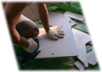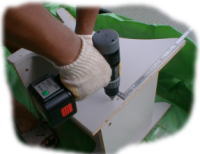 | 表面はメラミンが貼られているため 直接ビス止めすると割れて しまいますので、下穴をあけて ビス止めします。 差し金で正確に打ち込む場所を 決めて打ちます。 |