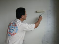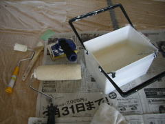 前回、廻り縁を塗装してあるので、いよいよ壁塗り本番です。