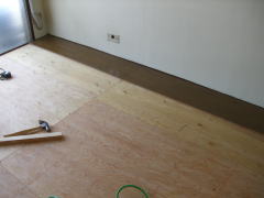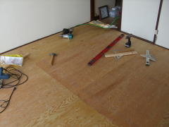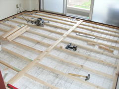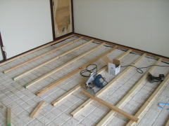 スチロール上の根太のアバレを防ぐためと床材の安手を考えて。