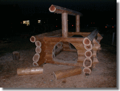 | 土曜日:仮設の土台にハーフログとシルログの加工、3ラウンド半まで積み上げました。 日曜日:後半の2段を積み上げ、コードログ・プレートログの加工と棟上。そしてなんと言っても開口部のデザインカットがとても緊張を要する作業でした。 どうですか!この見事な出来映え。あとは屋根を乗せたらほぼ完成です。 |